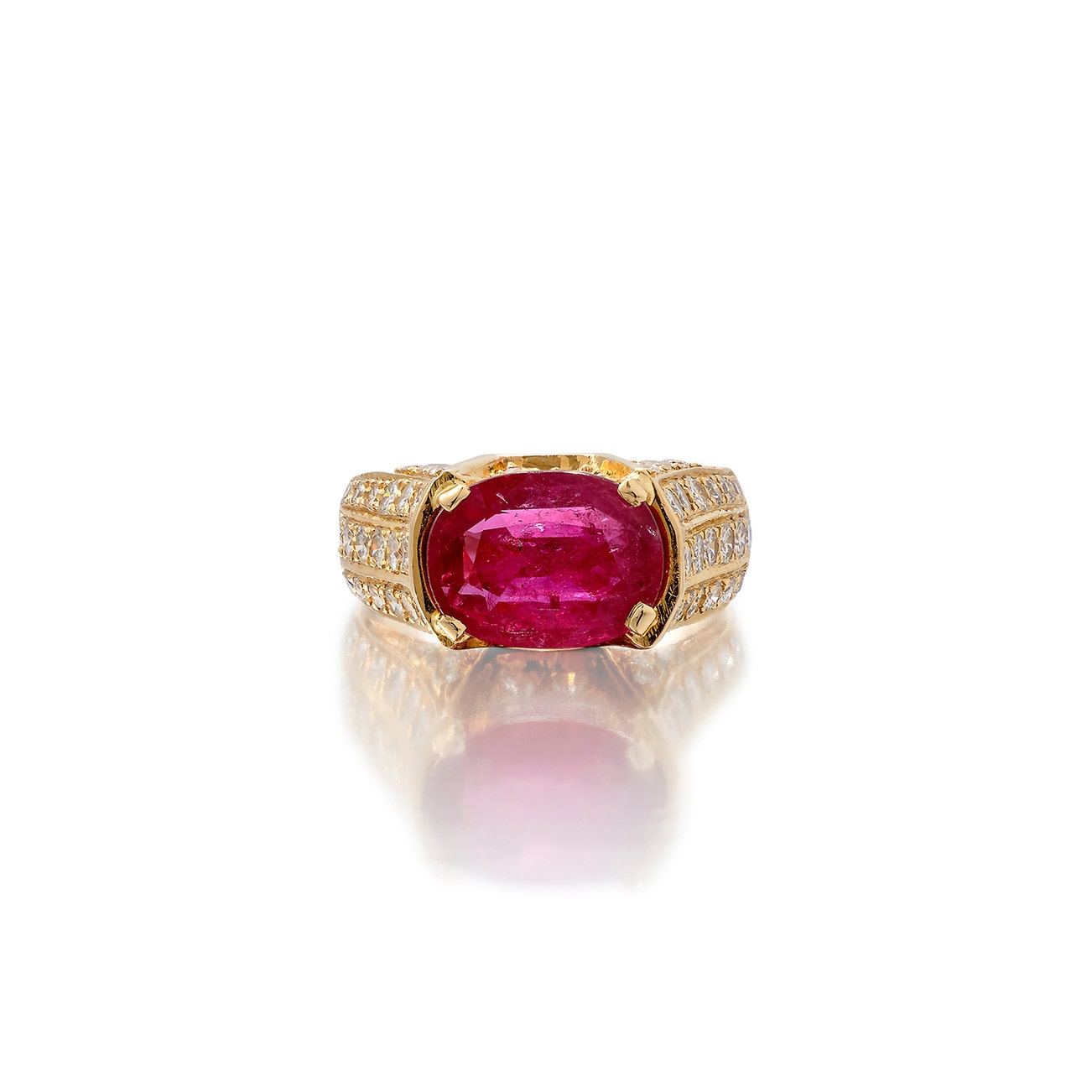 Set with an oval ruby weighing 3.25 carats, highlighted with brilliant-cut diamonds, size 50.