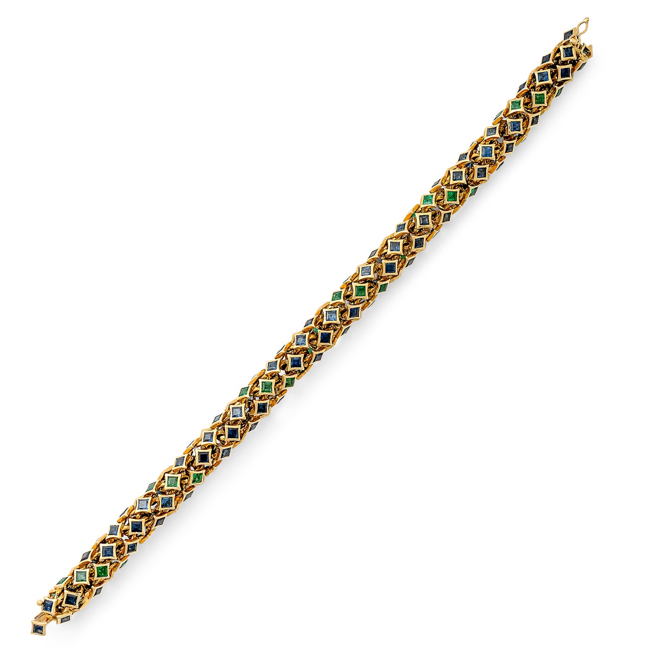 Set throughout with calibré-cut sapphires and emeralds,