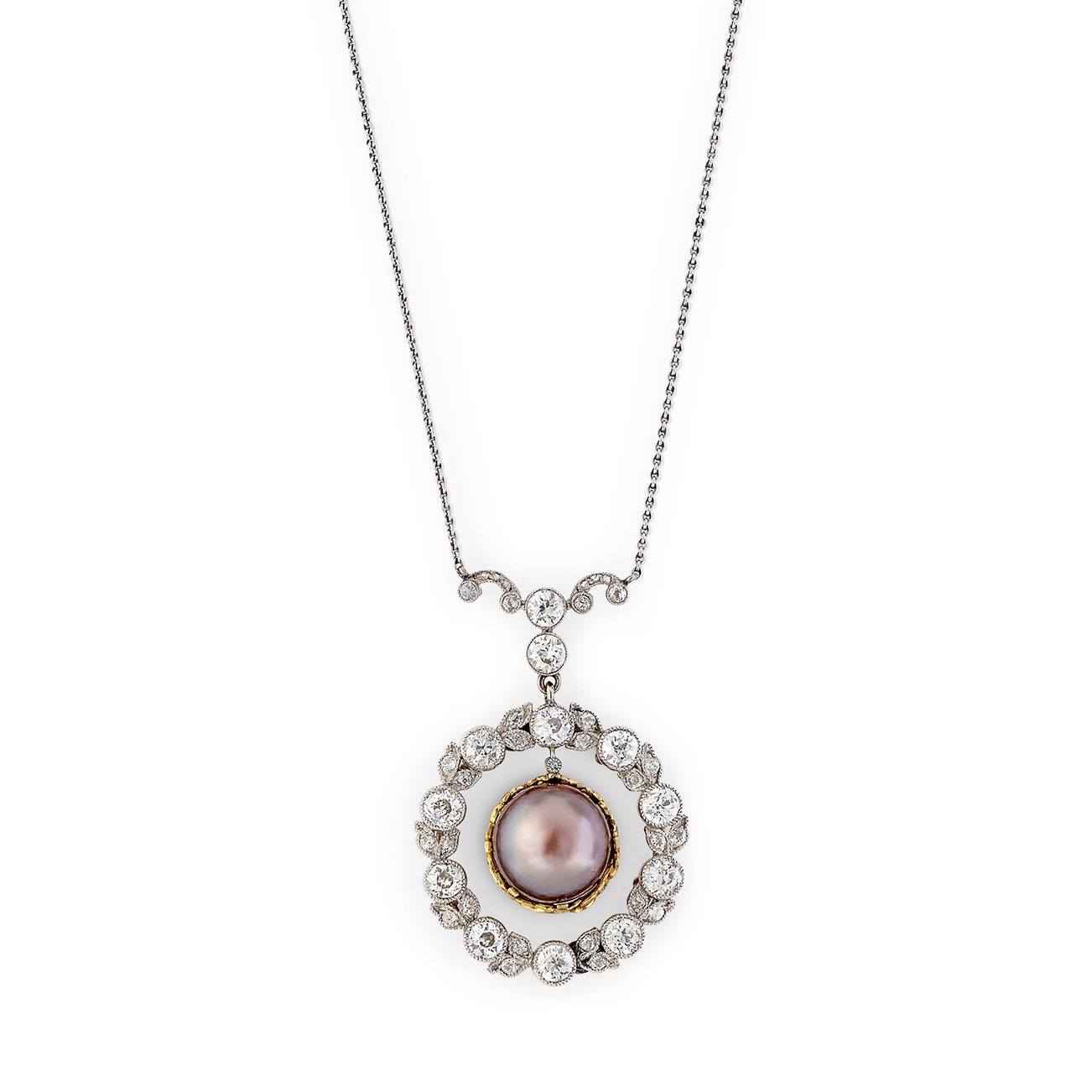 The pendant set with a button-shaped natural pearl measuring approximately 12.33mm, accented with circular-cut diamonds, suspended from a chain, length approximately 413mm