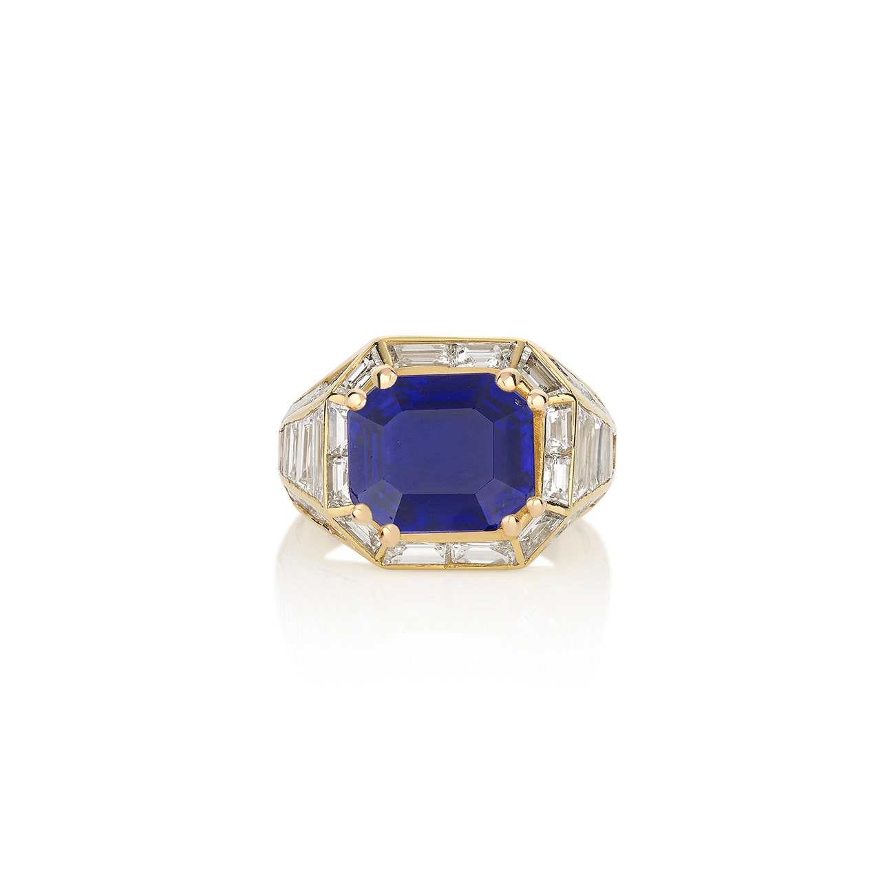 Set with a step-cut sapphire weighing 4.99 carats, highlighted with baguette and tapered baguette diamonds, size 51, Italian assay mark for gold.