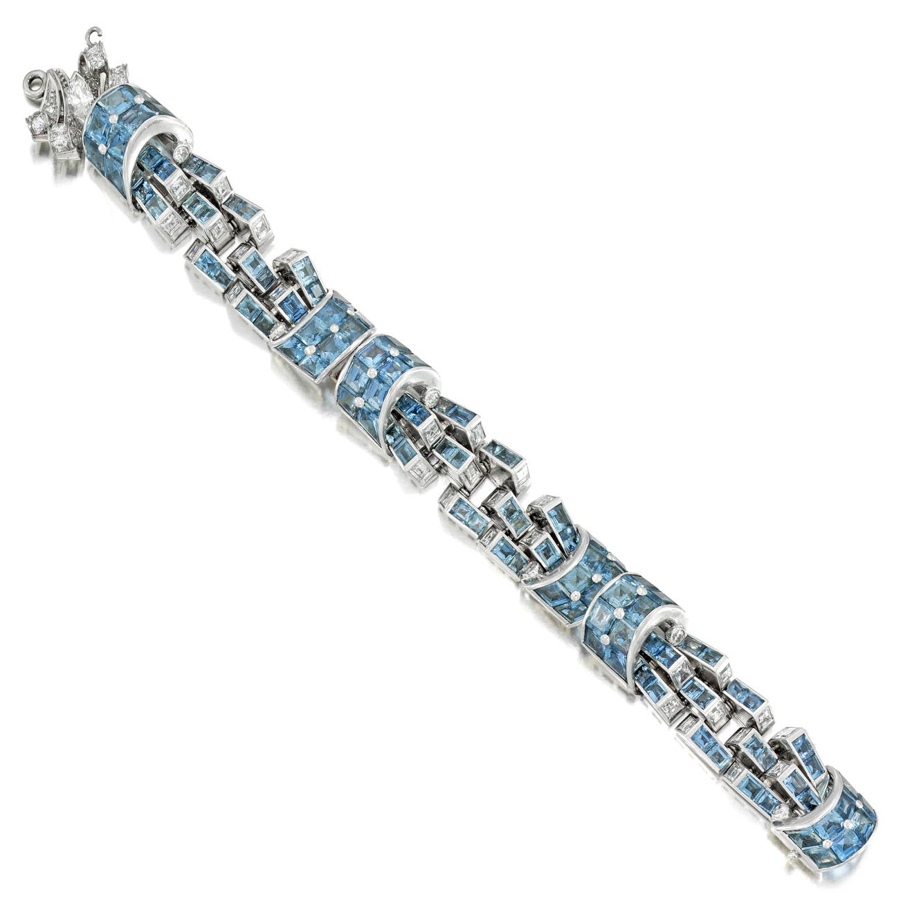 Set with step-cut aquamarines, accented with marquise-shaped, step- and brilliant-cut diamonds, mounted in platinum, length approximately 7 1/2 inches, inner circumference approximately 6 inches.