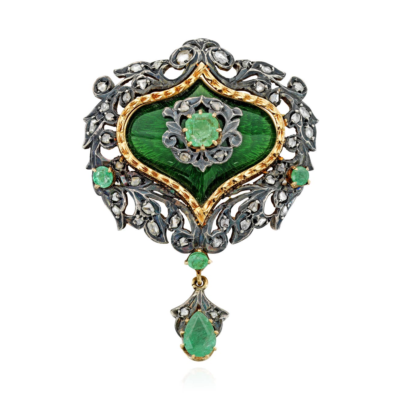 Of openwork design, applied with green enamel, set with pear-shaped, step- and circular-cut emeralds, accented with rose-cut diamonds,mounted in silver-topped 14k yellow gold, measuring approximately 1 3/4 x 2 1/4 inches.
