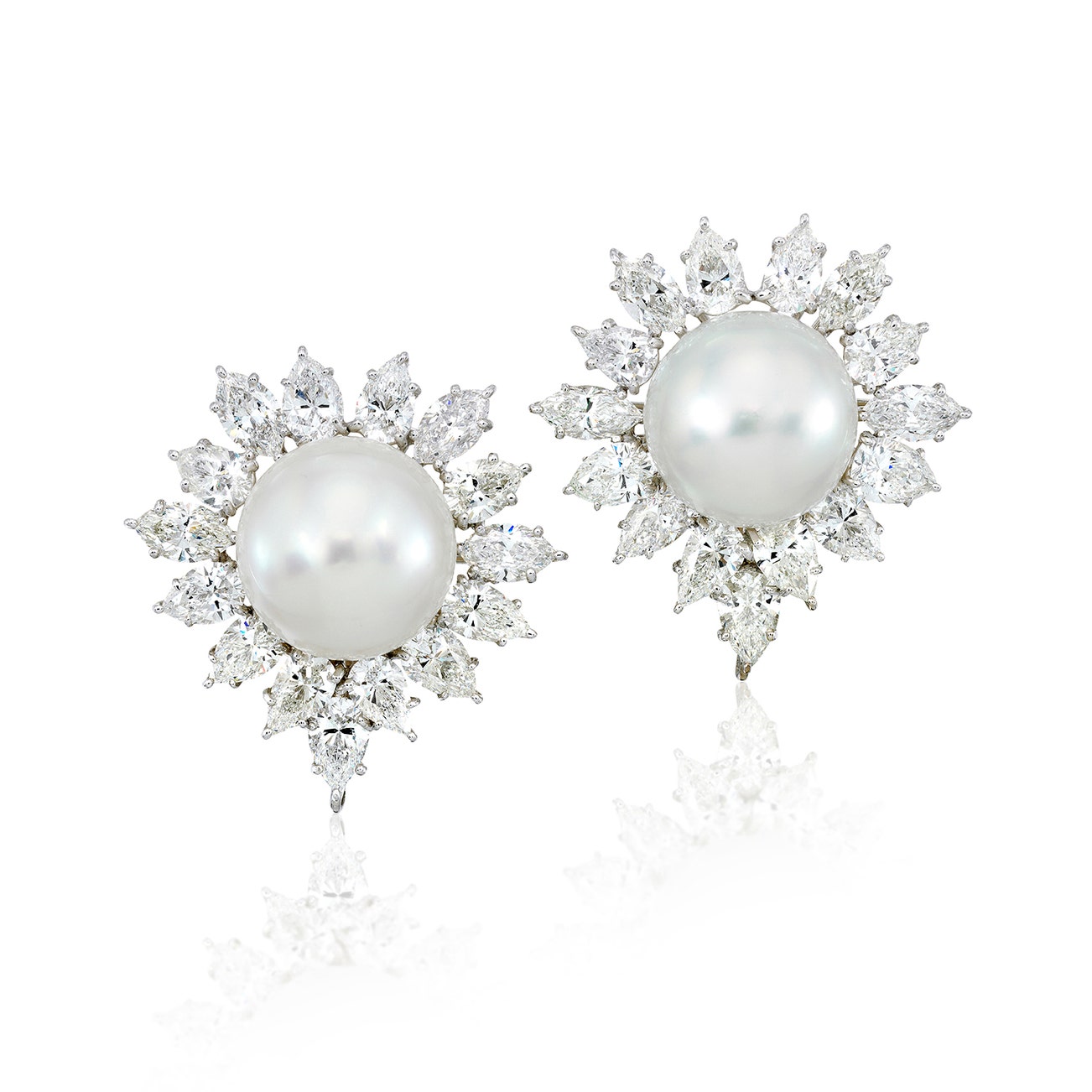 Each set with a cultured pearl measuring approximately 15.60 to 16.10 mm in diameter, framed by pear- and marquise-shaped diamonds, mounted in platinum and 18K white gold, length approximately 1 1/4 inch.
