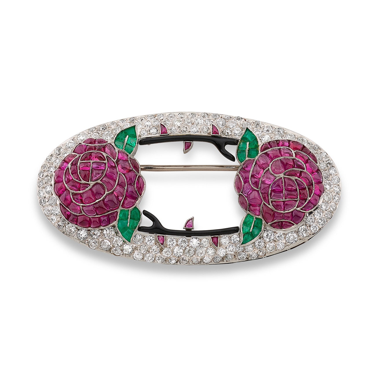 Depicting two roses, the petals composed of buff-top rubies, the leaves embellished with calibré-cut emeralds, the stems applied with black enamel, within a frame of circular-cut diamonds, measuring approximately 68 x 33mm, French assay marks for platinum.