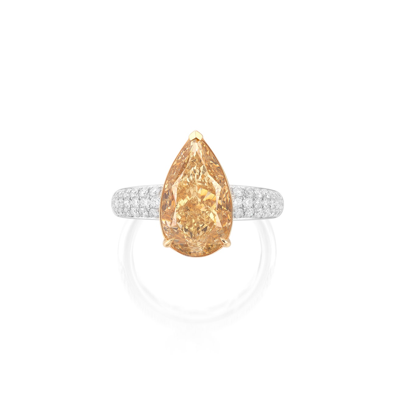 Set with a pear-shaped fancy brown-yellow diamond weighing 5.00 carats, between brilliant-cut diamond shoulders, mounted in white and yellow gold, size 6½.
