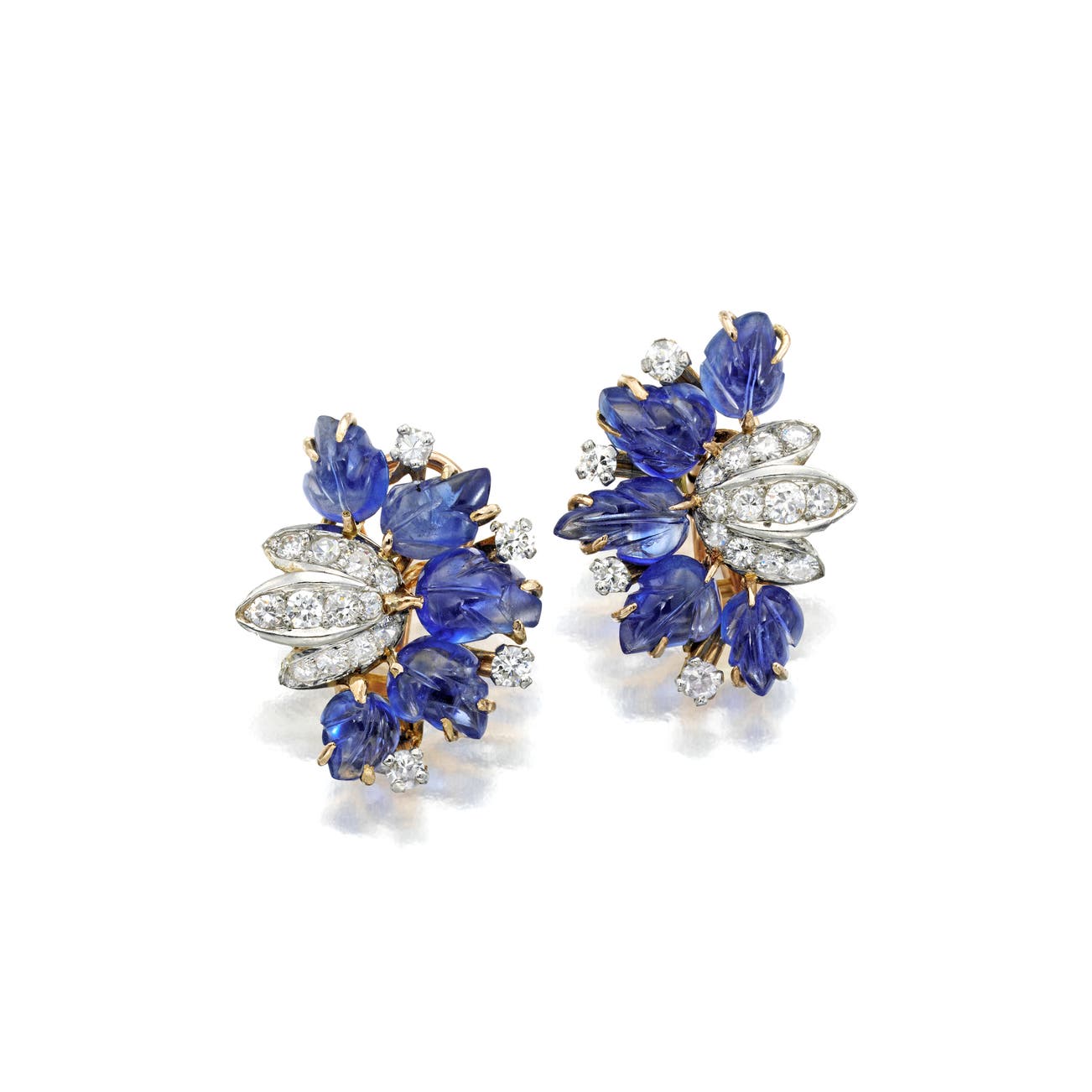 Set with carved sapphires in foliate motifs, accented with brilliant-cut diamonds, mounted in platinum and 14k yellow gold, post and hinged-back fittings, measuring approximately 1 x 3/4 inches each.