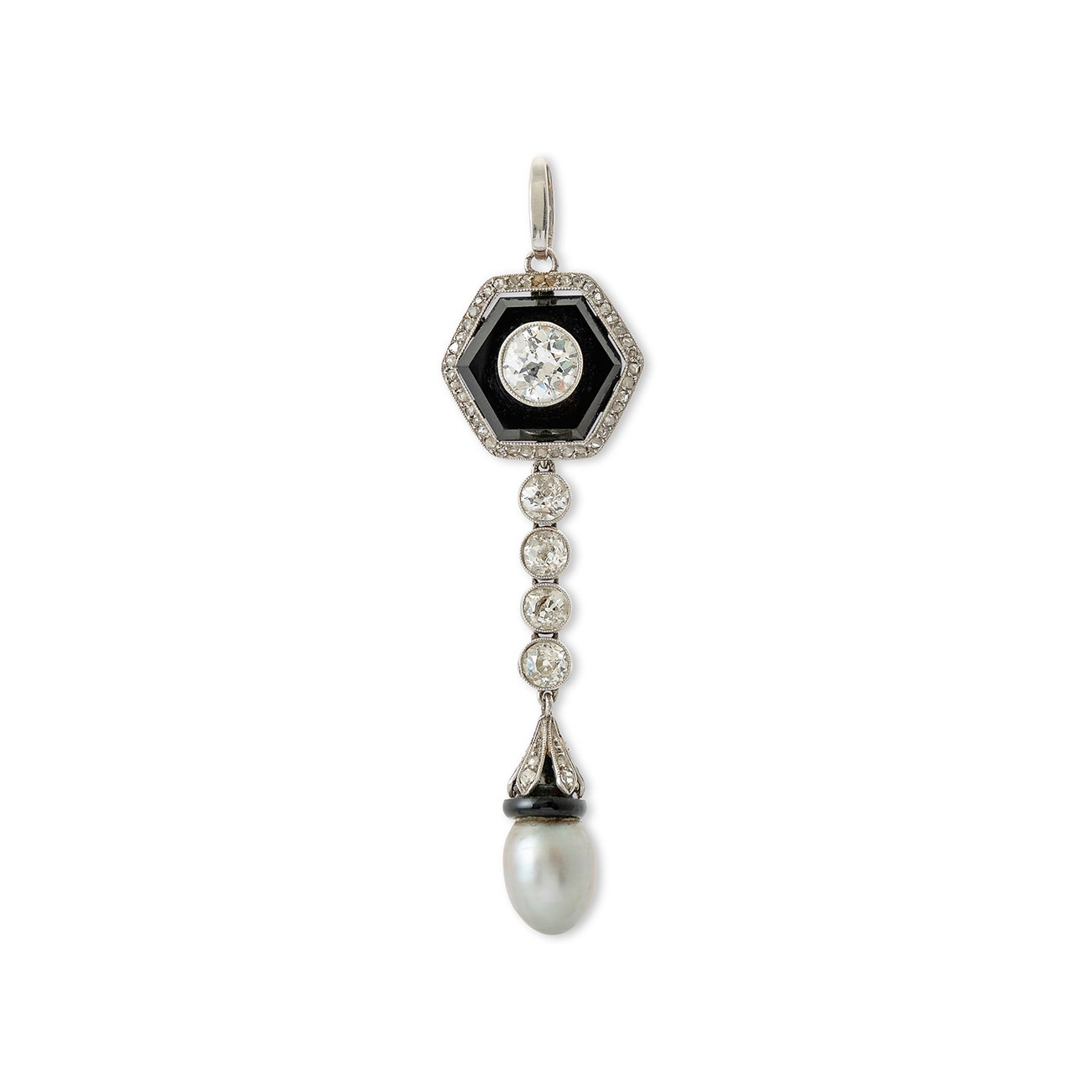 Set with a circular-cut diamond centered on a hexagonal onyx plaque, within a frame of rose-cut diamonds, suspending a line of circular-cut diamonds and a natural pearl drop measuring approximately 7.65 x 9.71mm, with an onyx and rose-cut diamond-set surmount, length approximately 63mm.