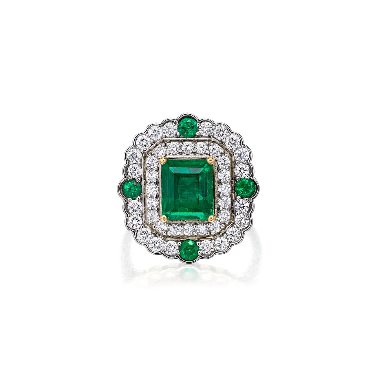 Set with a step-cut emerald weighing 2.15 carats, framed by brilliant-cut diamonds, highlighted by round-shaped emeralds, mounted in 18K white gold, size 6 3/4.