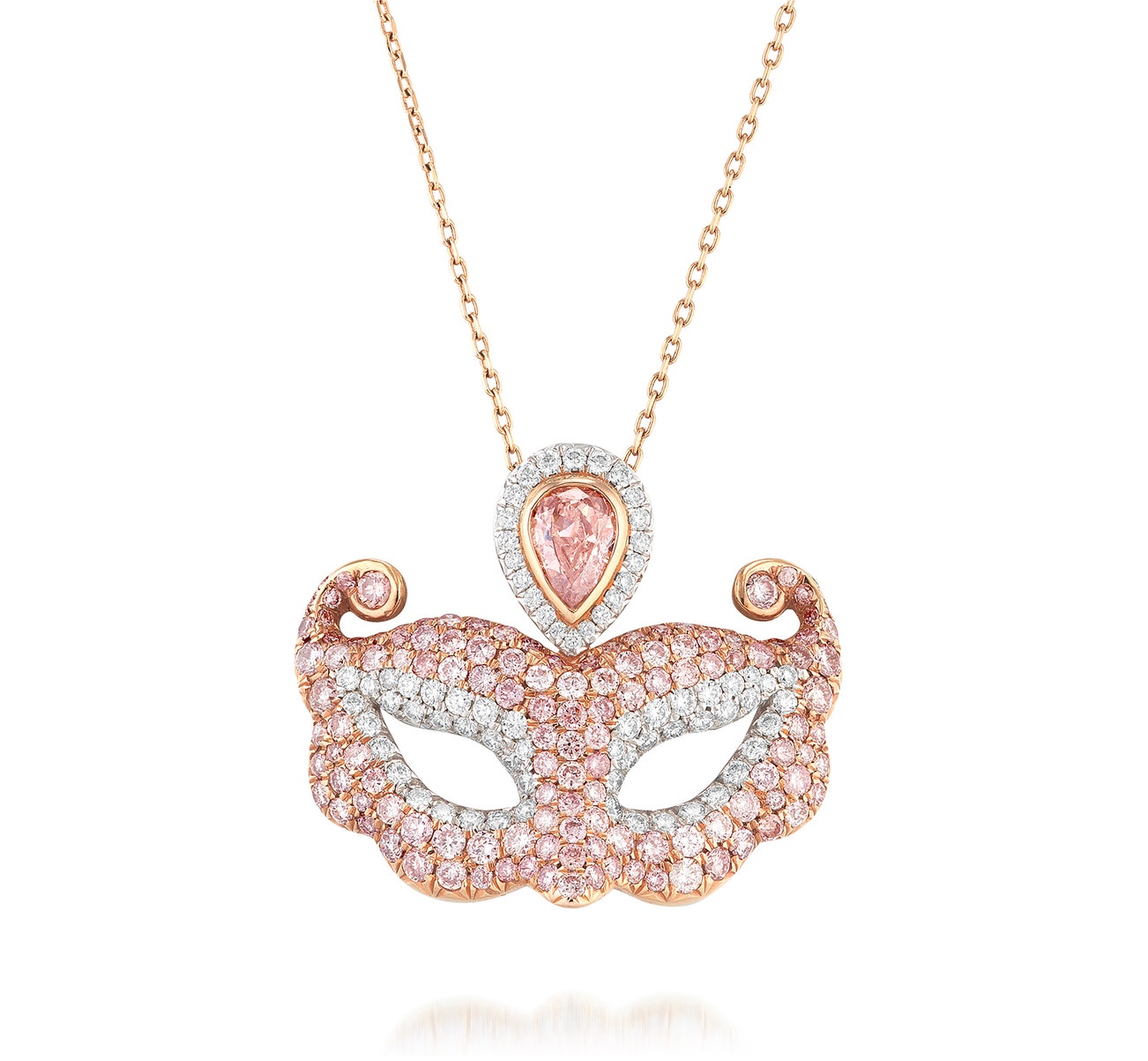 Designed as a Venetian mask, set with a pear-shaped fancy orangy pink diamond weighing 0.47 carat, within a surround of brilliant-cut diamonds, the mask pavé-set with brilliant-cut diamonds and diamonds of pink tint, to a fine link chain, mounted in white and pink gold, pendant length approximately 24 mm, link chain adjustable with maximum length approximately 445 mm.