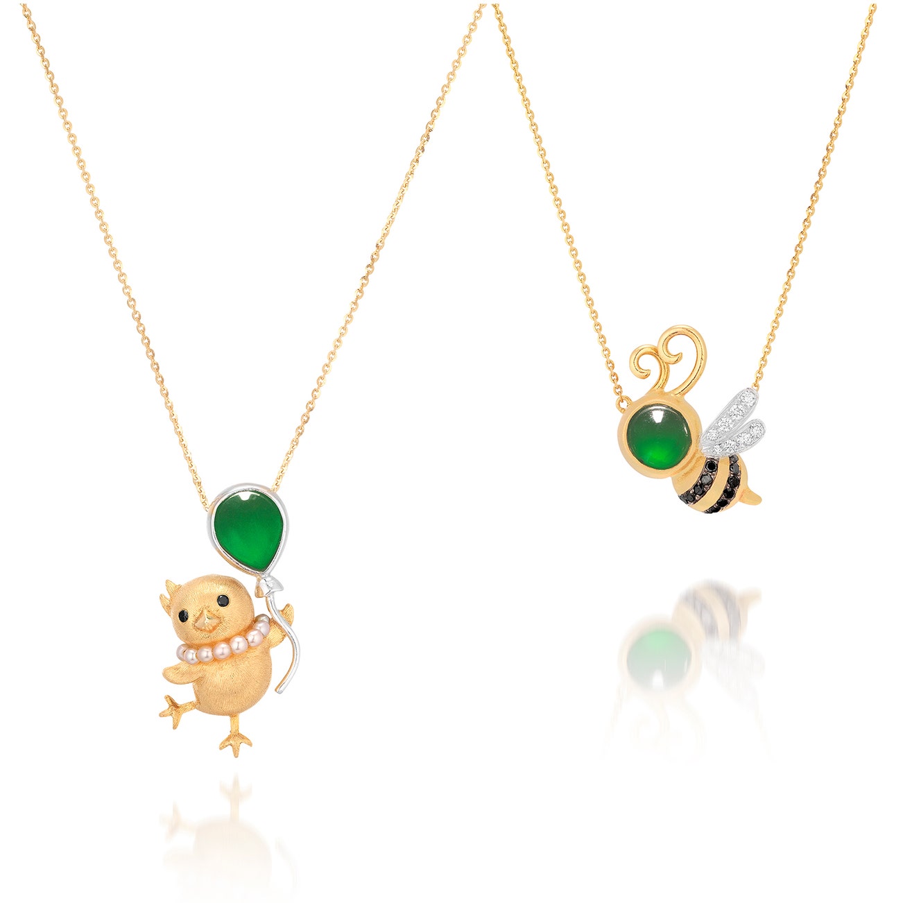 The first pendent necklace designed as a chick with black diamond eyes and seed pearl necklace, holding a pear-shaped jadeite cabochon balloon of bright emerald green colour and very good translucency, to a fine link chain, mounted in yellow and white gold, pendant length approximately 25 mm, link chain length approximately 400 mm; and the second necklace designed as a bee, with an oval jadeite cabochon head of brilliant emerald green colour and very good translucency, highlighted with brilliant-cut diamond wings and circular-cut black diamond body, to a fine link chain, mounted in yellow gold, adjustable length with maximum approximately 410 mm.