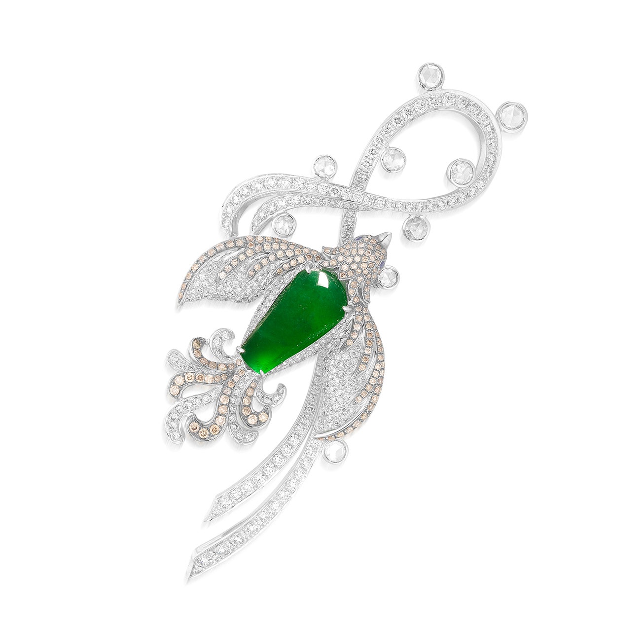 The brooch, designed as a bird in flight, the body set with a tapered jadeite cabochon measuring approximately 16.08 x 8.11 – 4.91 x 3.65 mm, of intense green colour and very good translucency, the head, wings and tail embellished with brilliant-cut diamonds and diamonds of brown tint, with circular-cut sapphire eyes, to the rose- and brilliant-cut diamond scrolls, mounted in white gold, length approximately 74 mm, accompanied by diamond-set white gold ring and pendant fittings.