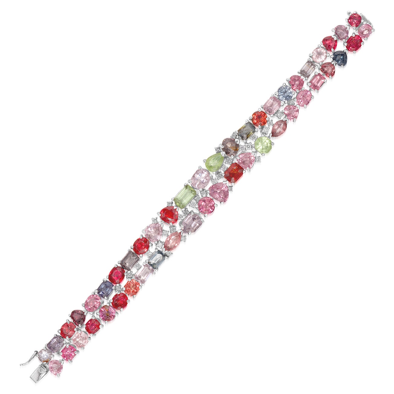 The tapered double row bracelet set with variously shaped coloured spinels and peridots, highlighted with brilliant-cut diamonds, mounted in platinum, length approximately 155 mm.