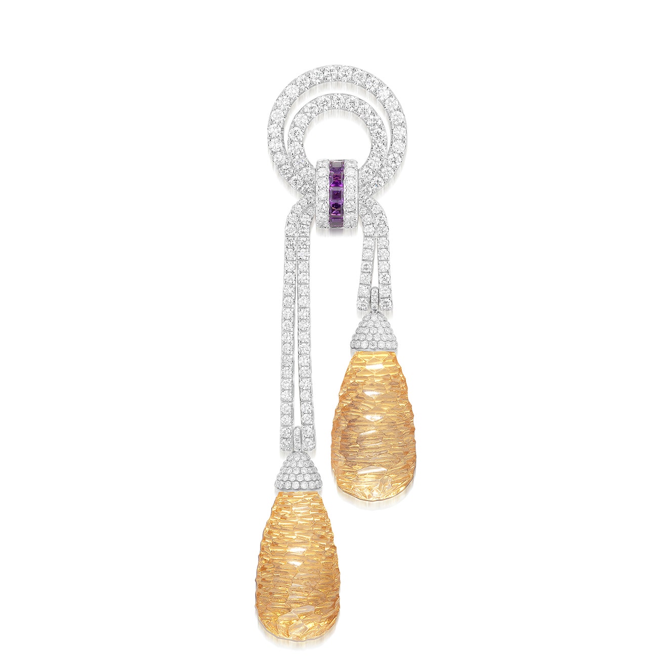 Suspending two drop-shaped carved citrines, decorated with brilliant-cut diamonds and square-cut amethysts, mounted in white gold, length approximately 85 mm.