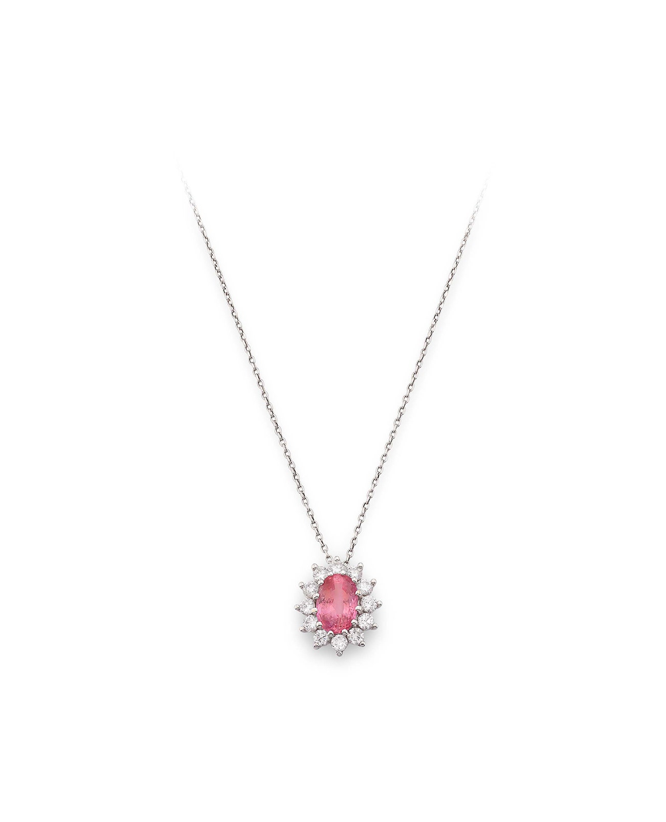 The pendant set with an oval padparadscha sapphire weighing 4.47 carats within a halo of brilliant-cut diamonds, suspended from a chain, length approximately 400mm.