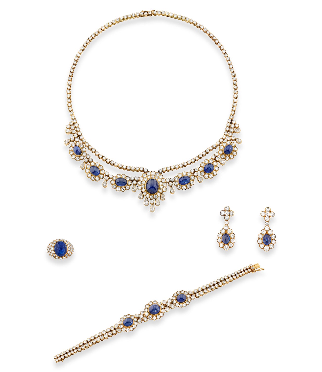 Comprising: a necklace of swag design, set with cabochon sapphires, accented with pear-shaped and brilliant-cut diamonds, length appoximately 430mm; a bracelet, length approximately 180mm; a pair of earrings, length approximately 40mm, post and butterfly fittings; and a ring, size 54.