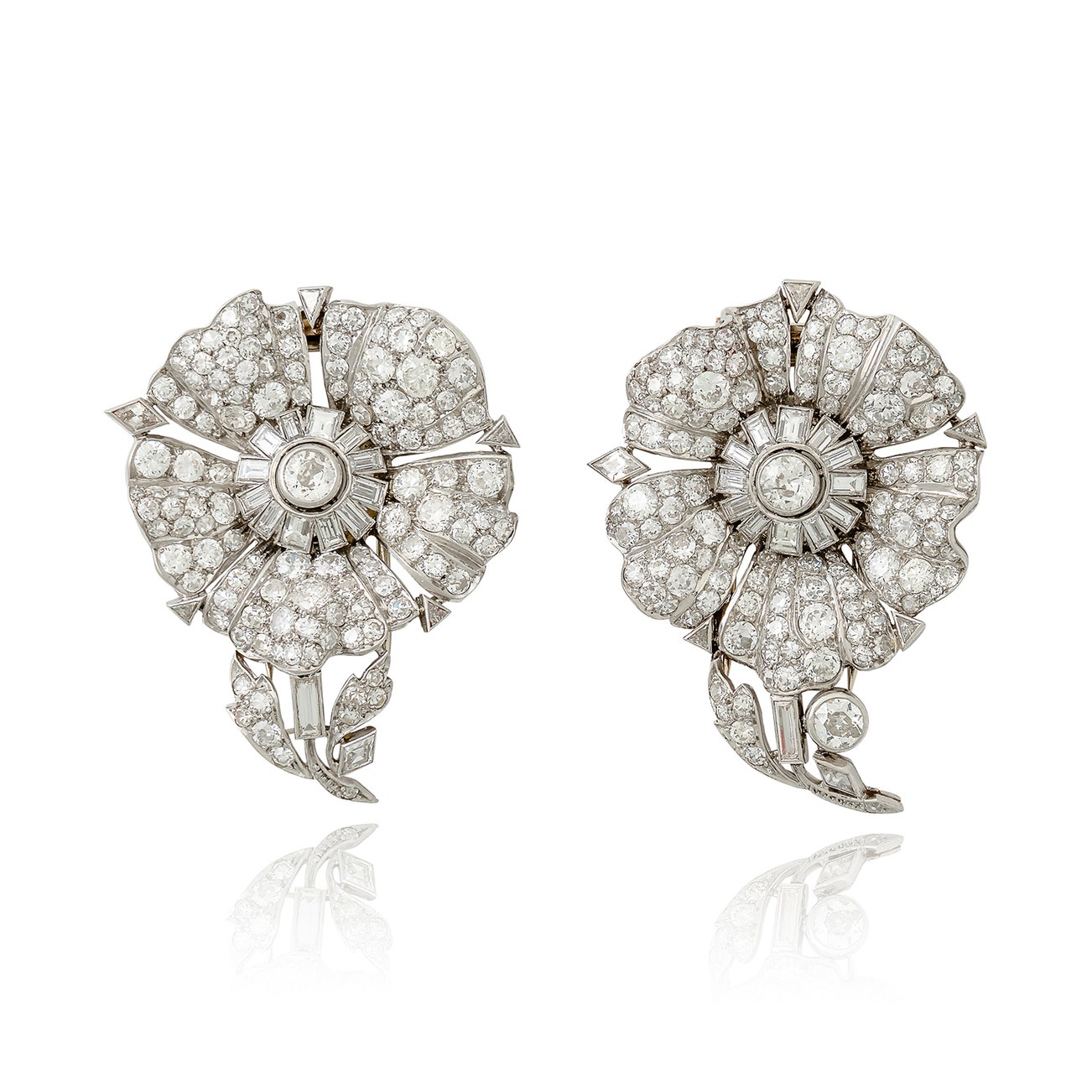 Each modelled as a flower, set with baguette, circular- and single-cut diamonds, measuring approximately 50 x 35mm.