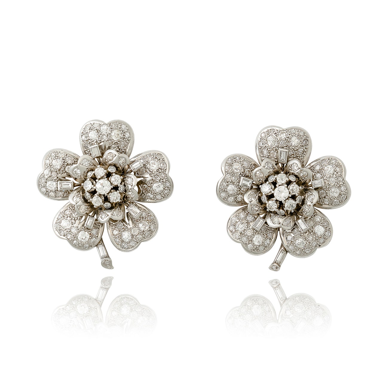 Each of floral design set with brilliant-cut and baguette diamonds,