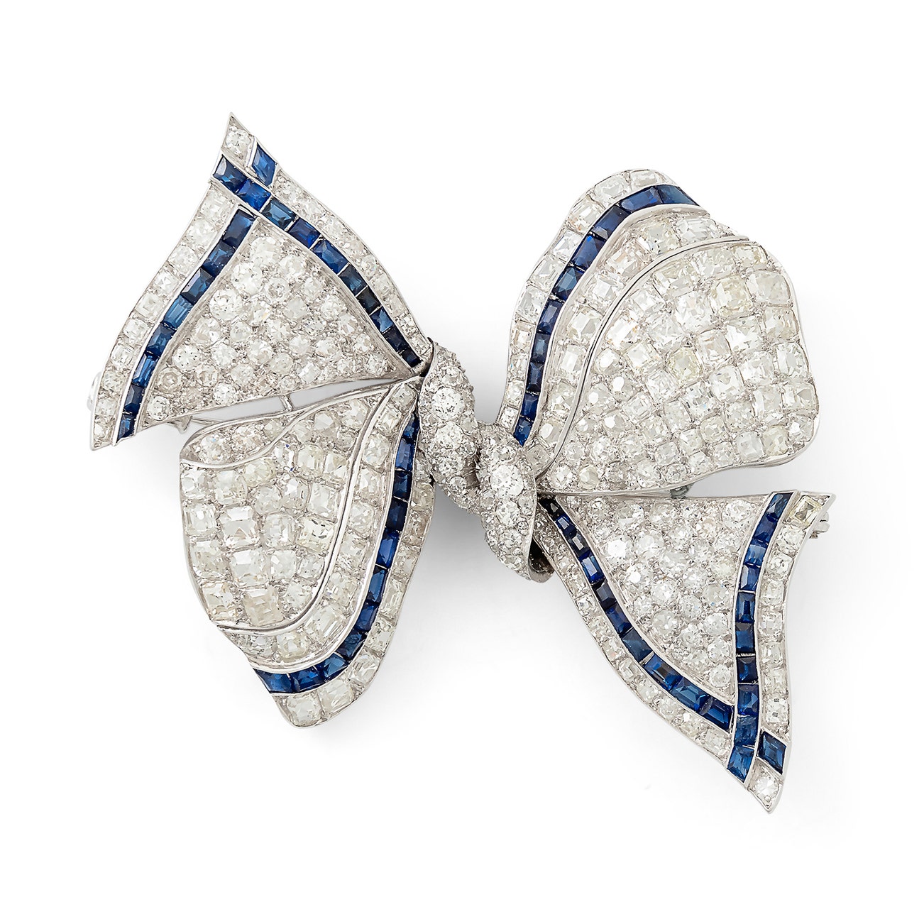 Designed as a bow, set with cushion-shaped, single-, circular- and square-cut diamonds, accented with calibré-cut sapphires, measuring approximately 57mm x 54 mm, French assay mark for gold.
