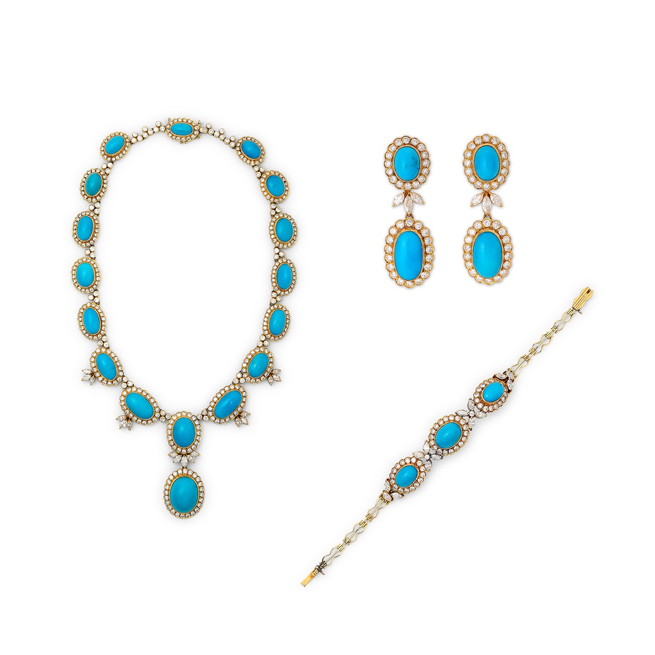 Comprising: a necklace, set with graduated cabochon turquoises, accented with marquise-shaped and brilliant-cut diamonds, length approximately 408mm, a bracelet, inner circumferences approximately 167mm, a pair of earrings, length approximately 48mm, post and hinged-back fittings, and a ring, size 58.