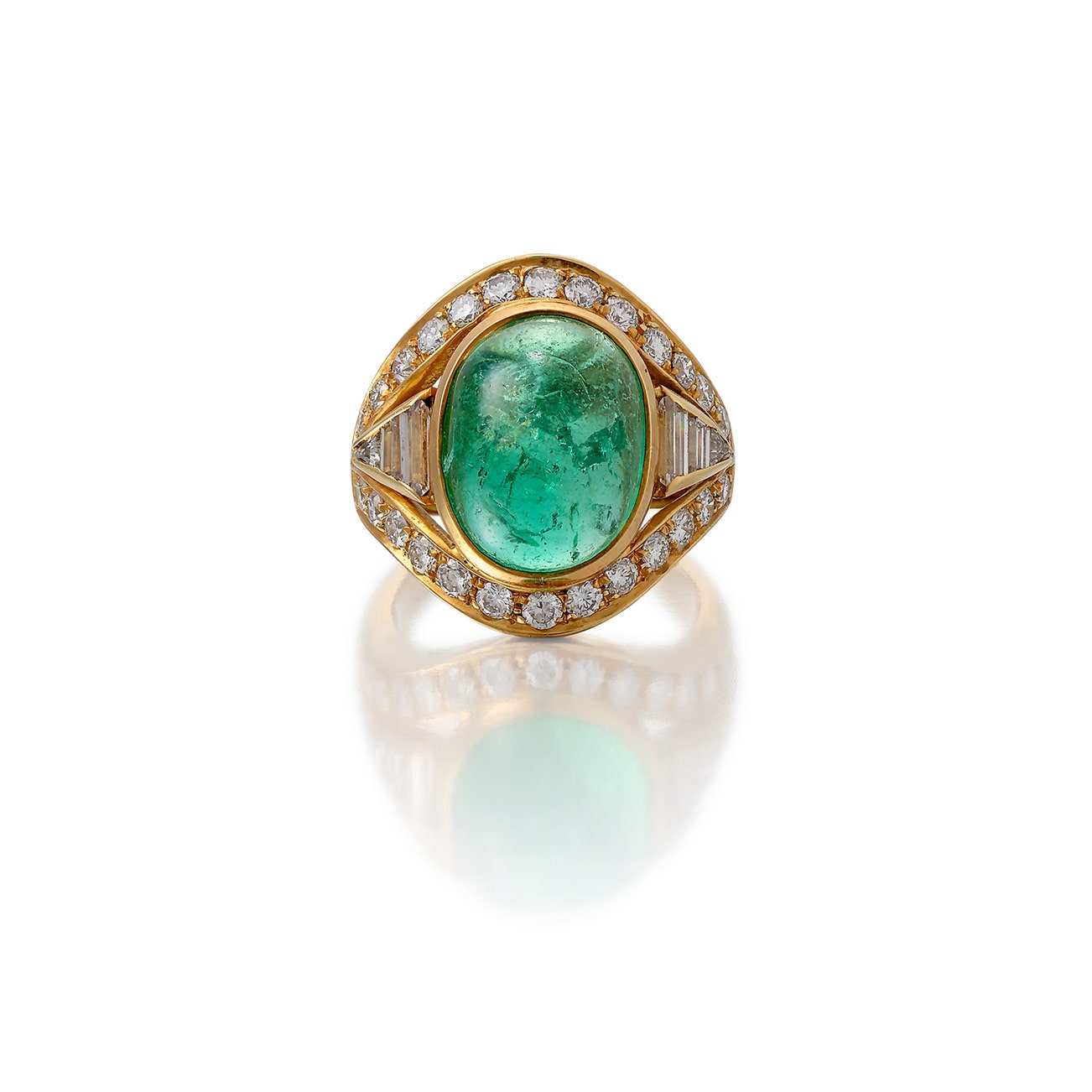 Set with a cabochon emerald, accented with baguette and brilliant-cut diamonds,