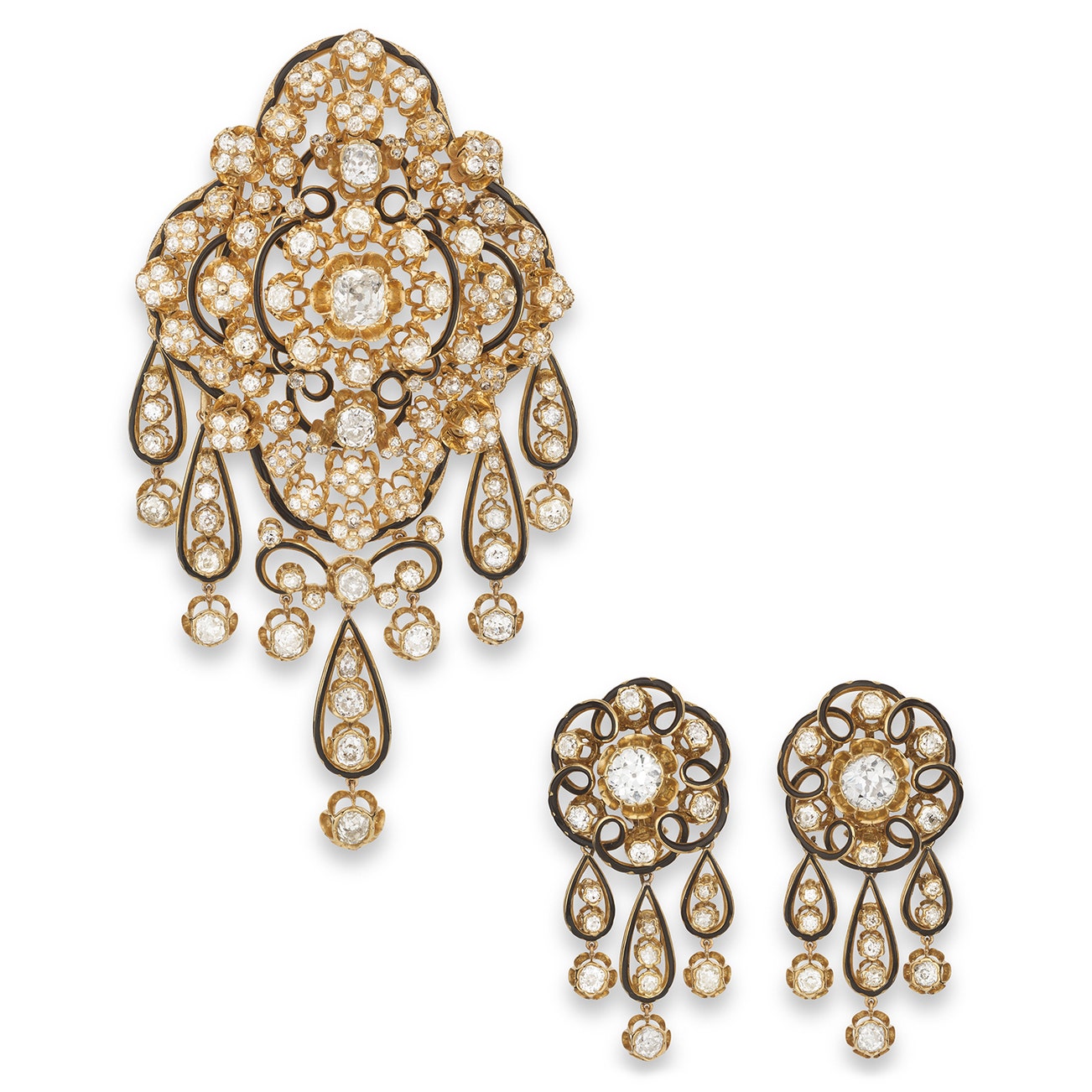 Comprising: a brooch, set with cushion-shaped, rose-, single- and circular-cut diamonds, the scrolled gold motifs applied with black enamel,measuring approximately 124 x 63mm, the brooch may be attached to a chain and worn as a necklace, length approximately 500mm, four drops from the fringe detachable, and a pair of earrings, measuring approximately 57 x 32mm, each with three drops from the fringe detachable, post and hinged-back fittings, fitted case.