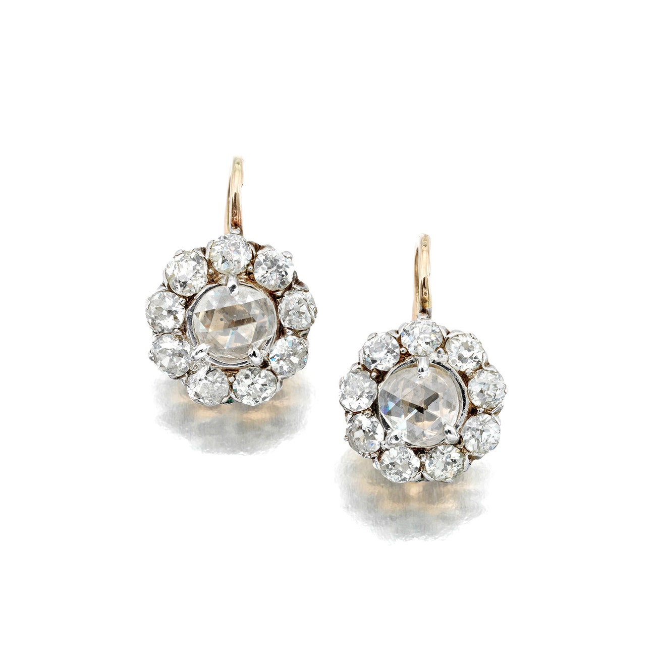 Each set with a rose-cut diamond, accented by old-cut diamonds, mounted in silver-topped gold, length approximately 3/4 inch.