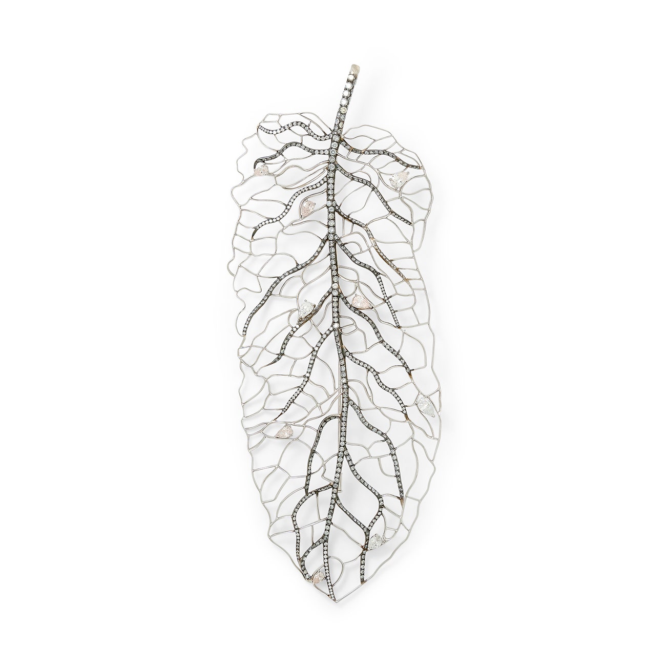 Designed as a leaf, set with pear-shaped diamonds of pink tint and near-colourless pear-shaped diamonds, accented with brilliant-cut diamonds, measuring approximately 192 x 73mm.