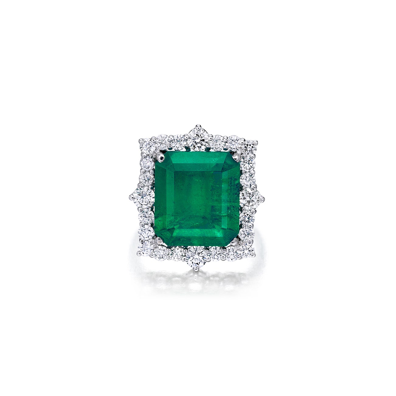 Centering a rectangular step-cut emerald, weighing 9.08 carats respectively, framed by brilliant-cut diamonds, size 7 3/4, mounted in platinum.