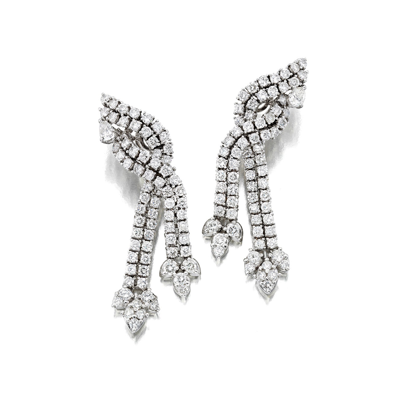 Of interwoven design, set with pear-shaped and brilliant-cut diamonds,