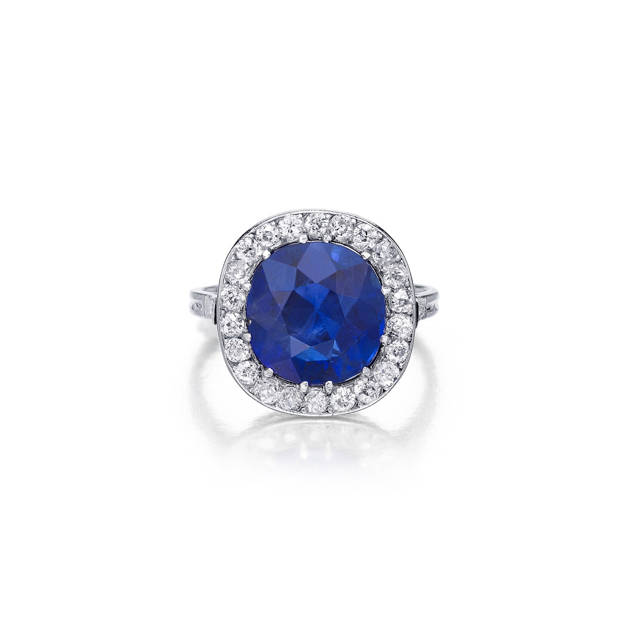 Centering a cushion-shaped sapphire weighing 6.31 carats respectively, framed by brilliant-cut diamonds, size 6 3/4, mounted in platinum.