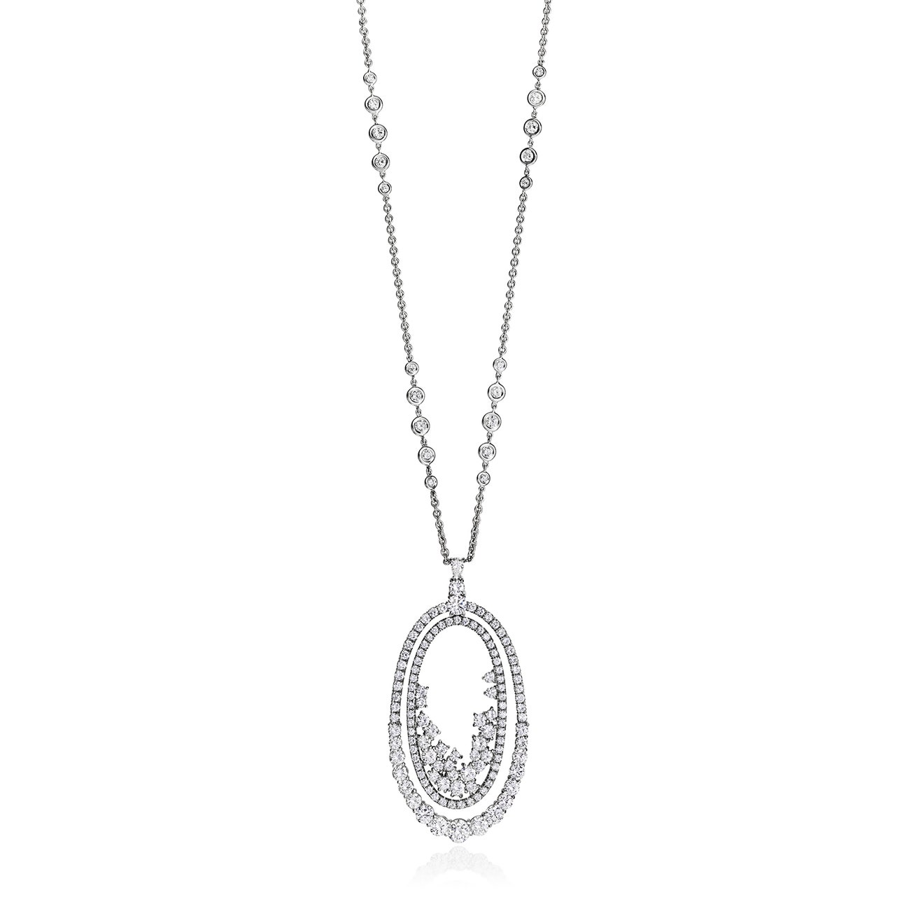 A collet-set diamond chain suspends a pendant framed in brilliant-cut diamonds with a pear-shaped diamond accent, mounted in 18K white gold, chain length approximately 32 inches, pendant length approximately 2 3/4 inches.