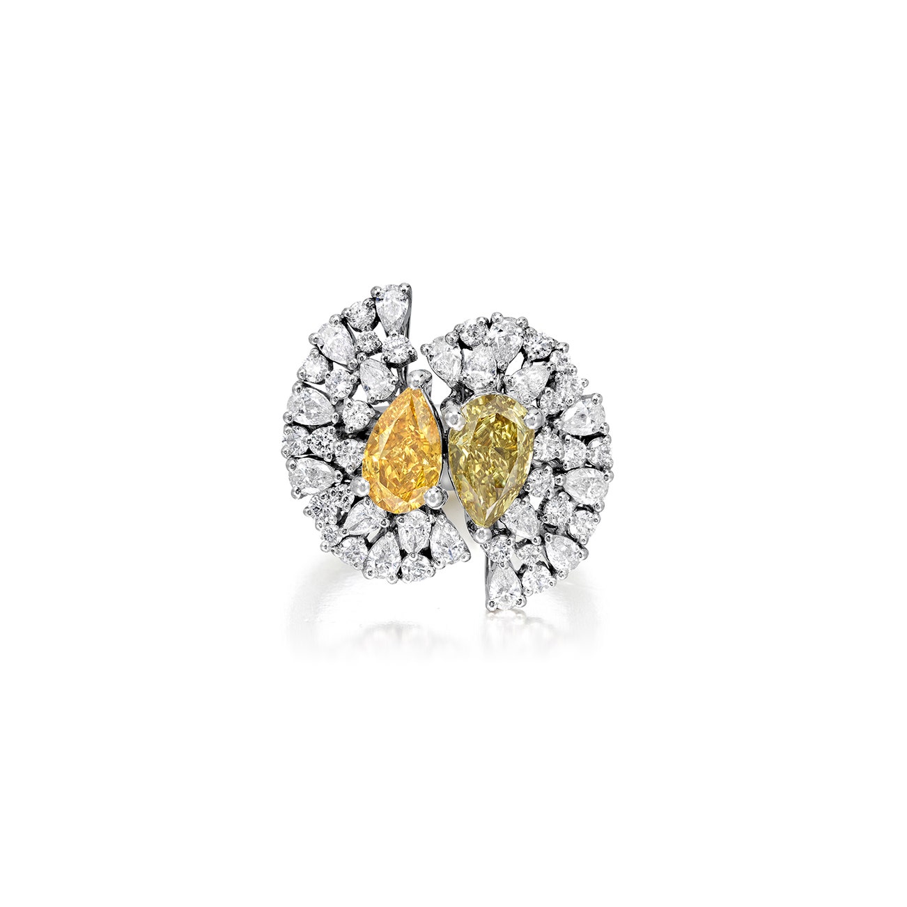 Set with a pear-shaped fancy deep brownish yellow diamond and fancy deep orangy yellow diamond weighing 1.15 and 1.00 carats, respectively, accented by pear-shaped and brilliant-cut diamonds, size 6 1/4, mounted in platinum.