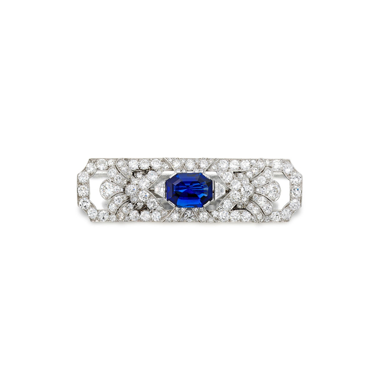 Of openwork design, set with an octagonal step-cut sapphire weighing 3.91 carats, accented with single-, circular-cut and tapered baguette diamonds, mounted in platinum and gold, length approximately 2 1/2 inches.