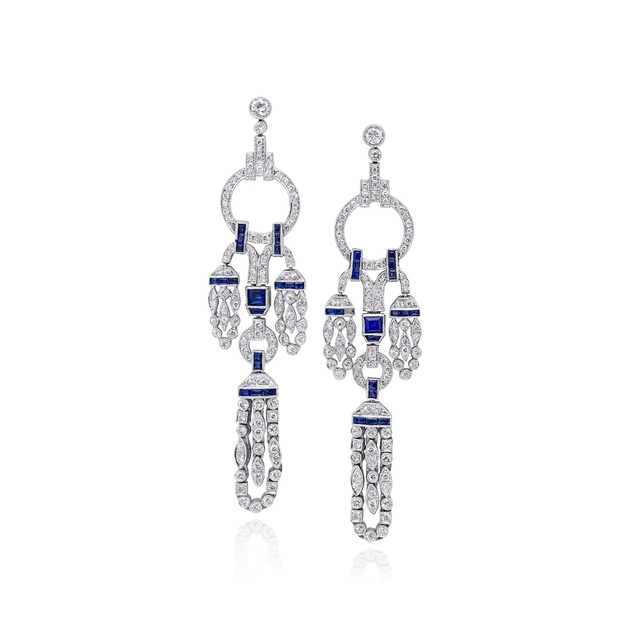 Of chandelier design, each set with step-cut sapphires, highlighted with brilliant-cut diamonds, mounted in 18k white gold, length approximately 2 1/2 inches.
