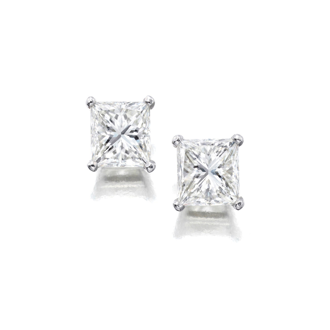 Each set with a square modified brilliant-cut diamond weighing 1.62 and 1.65 carats respectively, mounted in platinum.