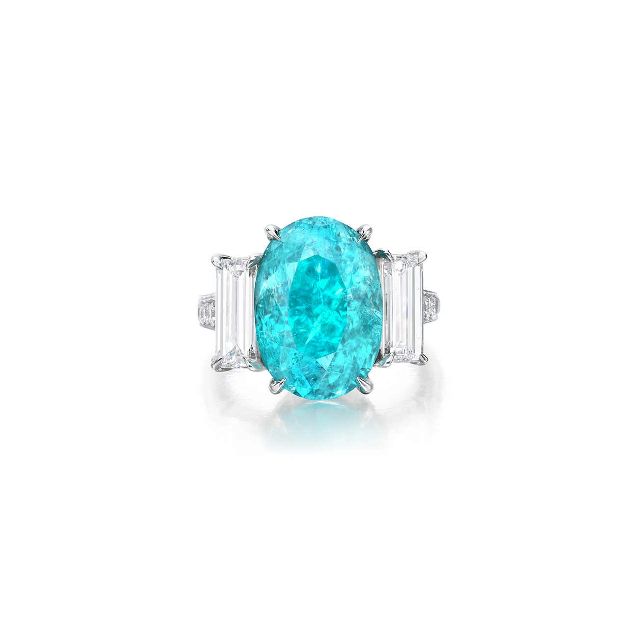 Set with an oval Paraiba tourmaline weighing 10.11 carats, framed by baguette diamonds, further accented with brilliant-cut diamonds, size 6 1/2, mounted in platinum.