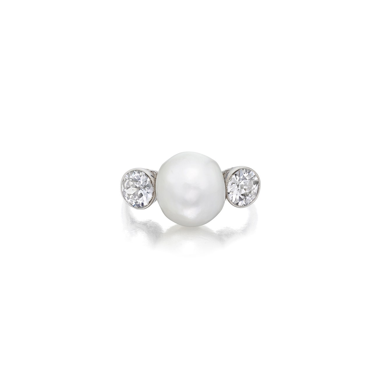 Set with a near-button shaped natural pearl measuring approximately 11.17 x 10.20 mm, accented by circular-cut diamonds, size 8 1/4, mounted in platinum.