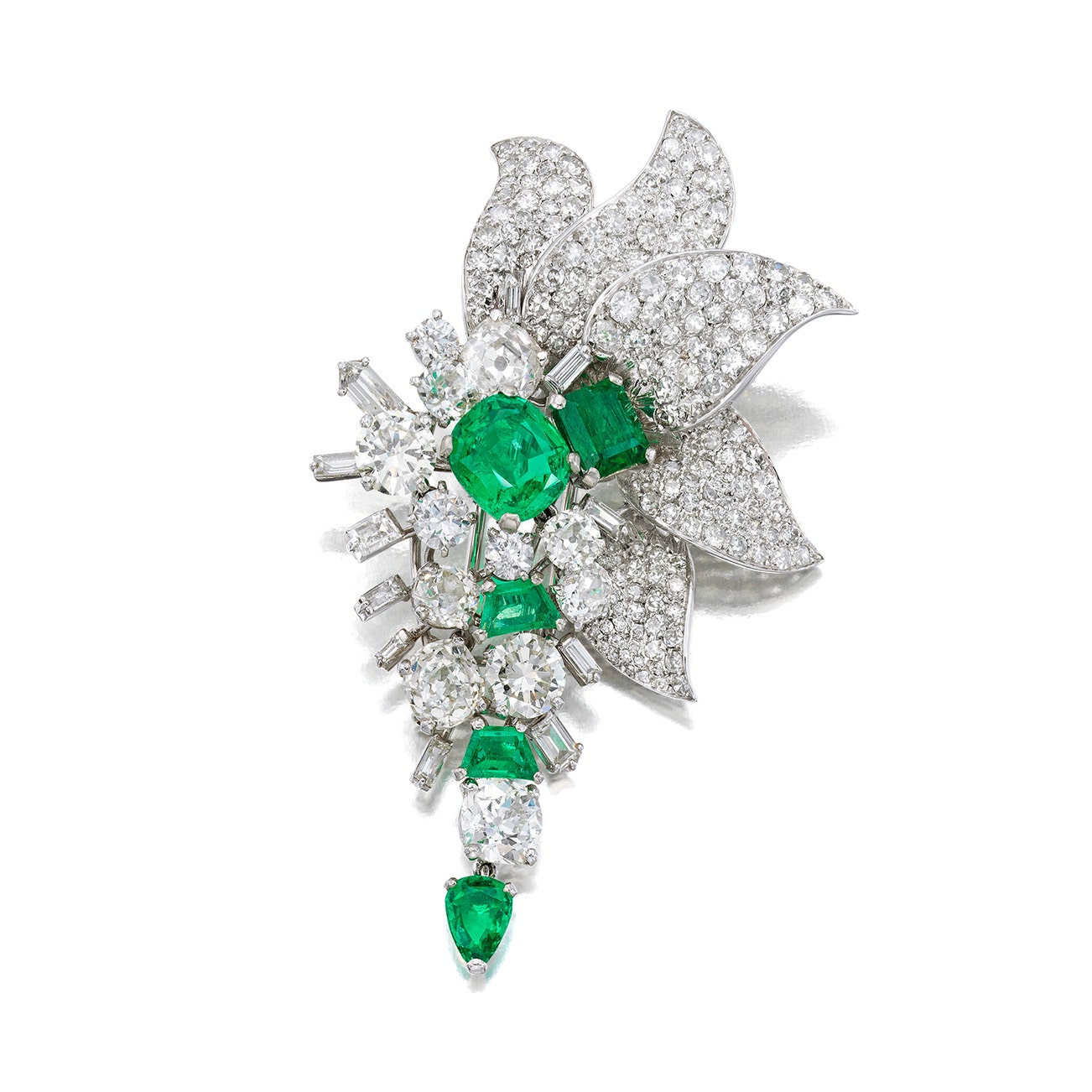 Of floral design set at the center with a cushion-shaped emerald weighing 3.14 carats, further set with a step-cut, shield-, and pear-shaped emeralds, the leaves set with circular- and single-cut diamonds, the articulated cascade set with cushion-shaped, circular-cut and baguette diamonds, measuring approximately 3.0 x 1.7 inches, with French maker's mark and assay mark for gold.