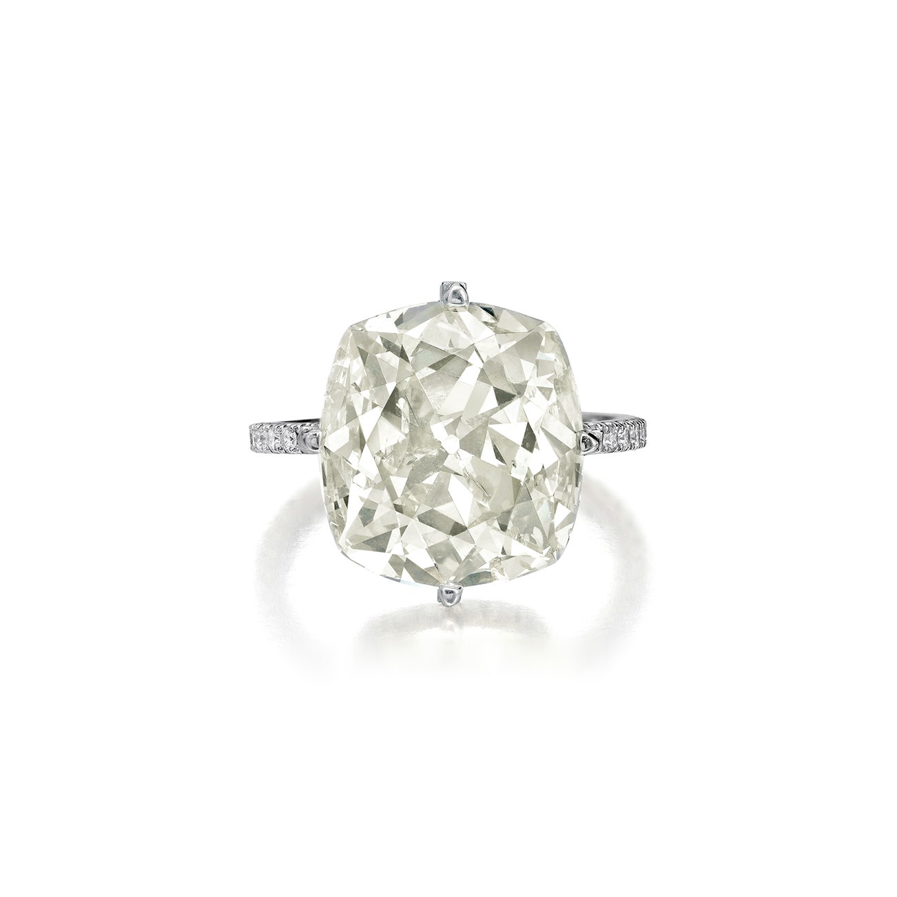 Set with a cushion modified brilliant cut diamond weighing 9.29 carats, highlighted with brilliant-cut diamonds, size 8, mounted in 18k white gold.