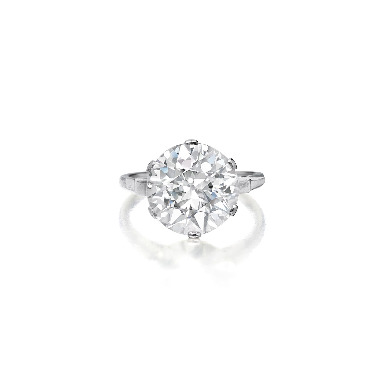 Set with a brilliant-cut diamond weighing approximately 6.58 carats, size 7 1/2, mounted in platinum.