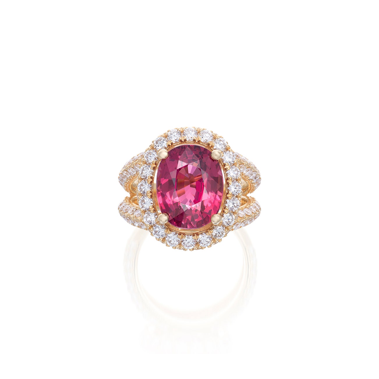 Set with an oval spinel weighing 6.67 carats, to the brilliant-cut diamond surrounds and bifurcated shoulders, mounted in yellow gold, size 6¼.