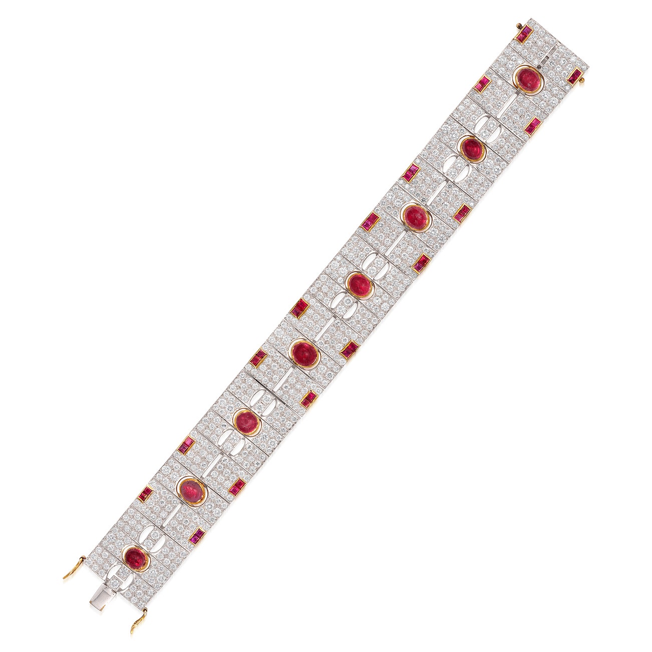 Set with eight oval ruby cabochons, decorated with brilliant-cut diamonds and square-cut rubies, mounted in white and yellow gold, length approximately 176 mm.