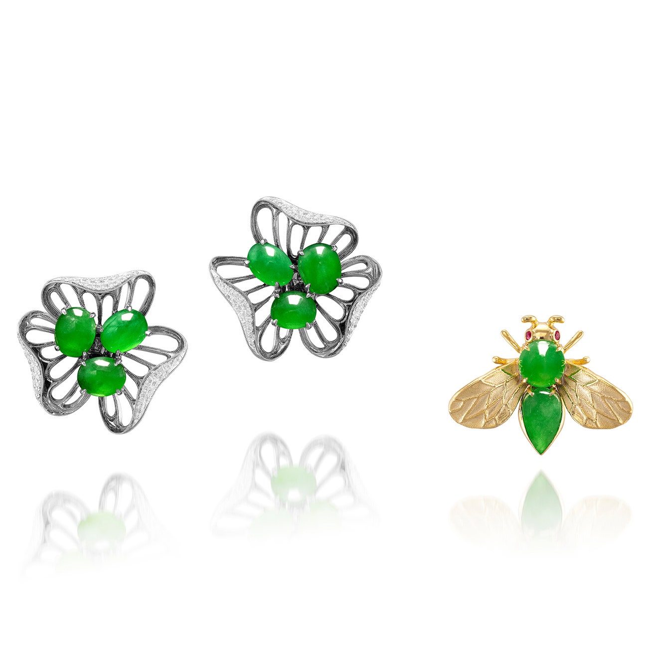 The pair of earrings of floral motifs, each centring upon three oval jadeite cabochons, measuring approximately 7.70 x 6.36 x 3.55 - 6.51 x 5.55 x 2.48 mm, of bright green colour and very good translucency, to the openwork petals highlighted with brilliant-cut diamonds, mounted in blackened gold, length approximately 25 mm; and the pendant designed as a bee, body set with round and pear-shaped jadeite cabochons, measuring approximately 6.85 x 4.08 mm and 9.98 x 6.13 x 3.06 mm respectively, of bright green colour and very good translucency, with ruby eyes, mounted in yellow gold, length approximately 20 mm.