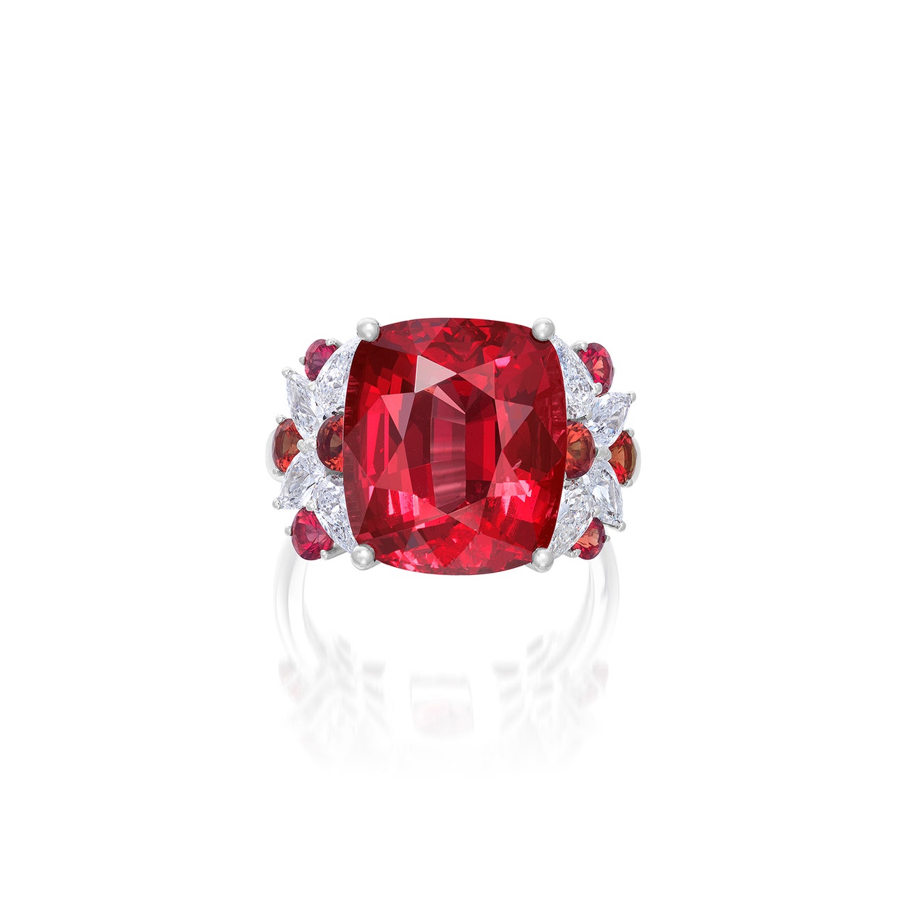 Set with a cushion-shaped spinel weighing 10.10 carats, shouldered by pear-shaped diamond and circular-cut spinel clusters, mounted in white gold, size 6½.