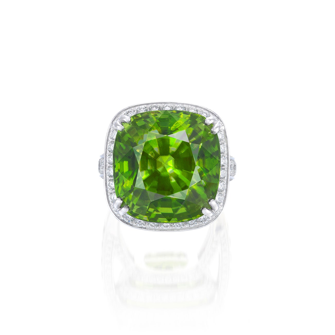 Set with a cushion-shaped peridot weighing 41.06 carats, to the brilliant-cut diamond surround, gallery and shoulders, mounted in platinum, size 6½.