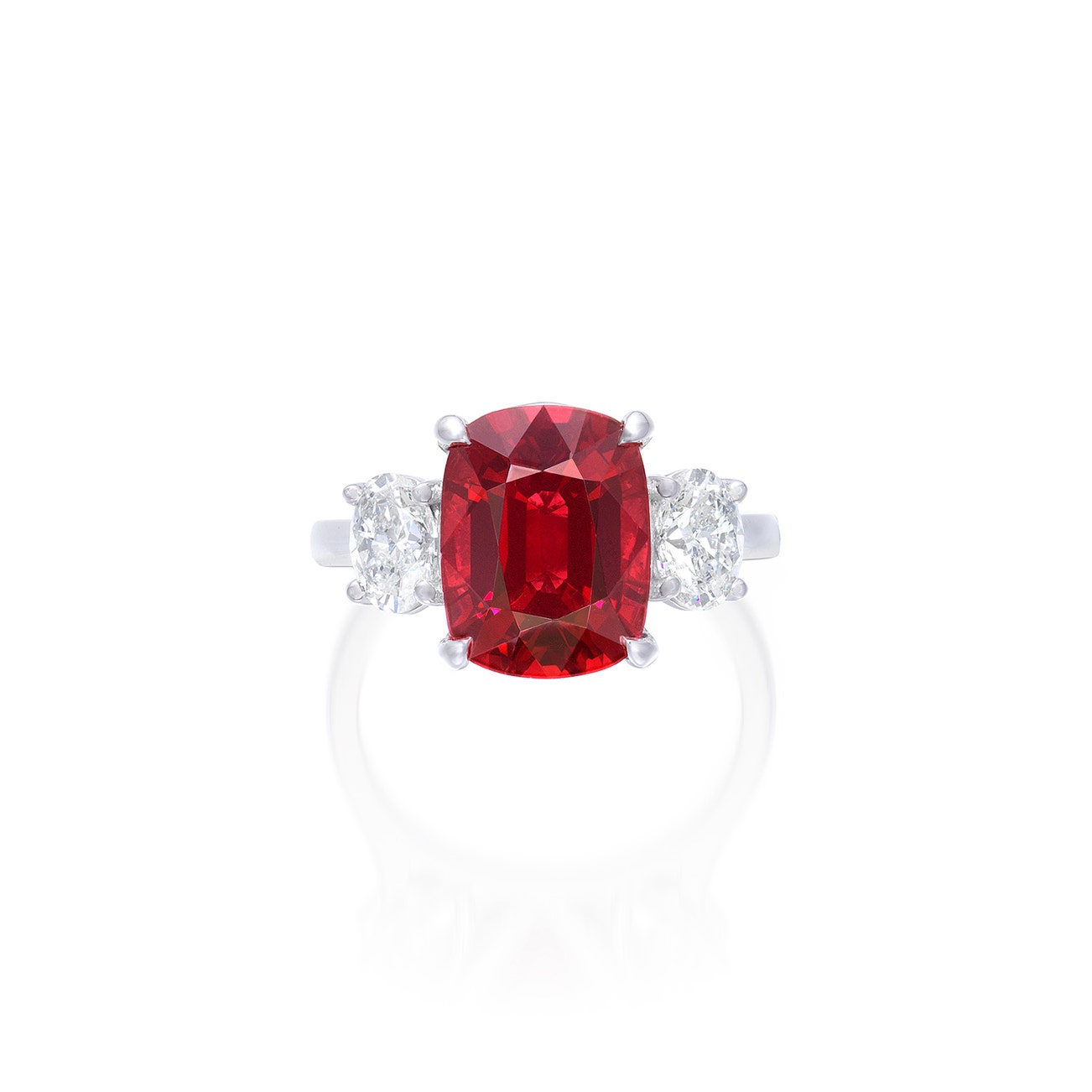 Set with a cushion-shaped spinel weighing 4.97 carats, flanked by two oval diamonds, mounted in platinum, size 6¼.