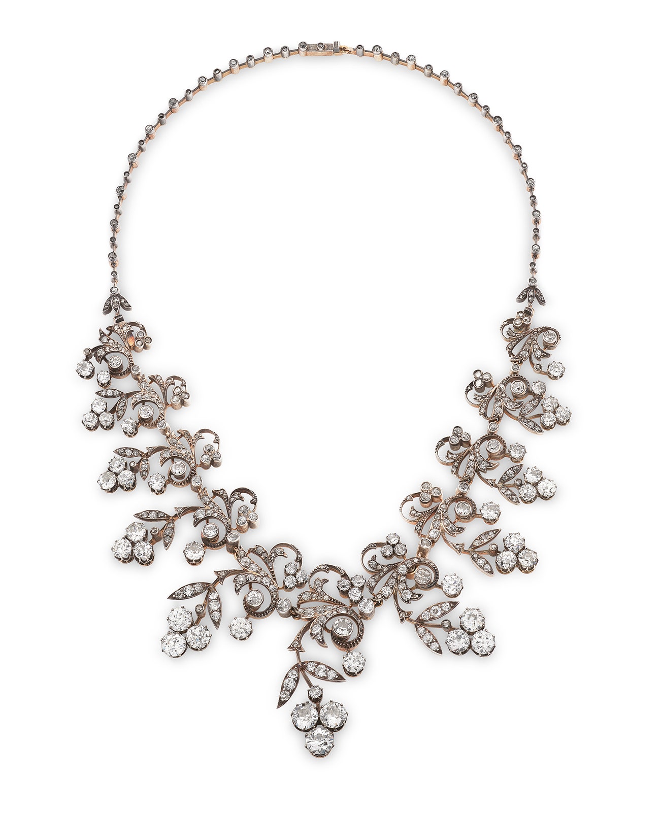 Of floral and foliate design, set with circular-, single- and rose-cut diamonds, necklace length approximately 440mm, central part detachable and may be worn as a tiara, inner circumference approximately 230mm, or a brooch, measuring approximately 48 x 66mm, French assay mark for gold, fitted case stamped Guy Fils.