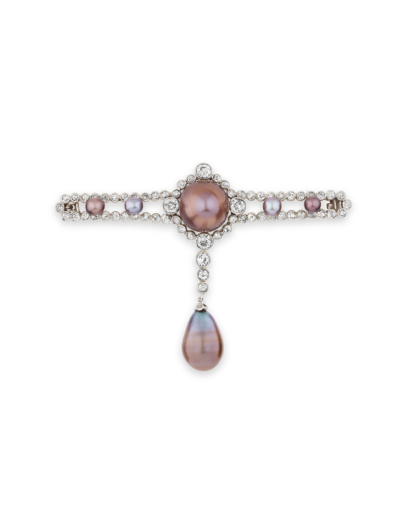Set with a button-shaped greyish brown natural pearl measuring approximately 11.72-12.26 x 9.35mm and a drop-shaped greyish brown natural pearl measuring approximately 9.95-10.30 x 14.75mm, highlighted with circular-cut diamonds and button-shaped pearls measuring from approximately 3.95mm to 4.45mm, measuring approximately 50 x 70mm, Austrian maker's mark for Josef Ourednik.