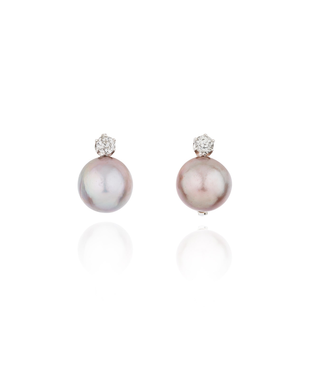 Each set with a button-shaped light grey and light brownish grey natural pearl measuring 9.61-9.80 x 9.20mm and 9.50-9.74 x 9.03mm respectively, accented with a circular-cut diamond, length approximately 15mm, post and hinged-back fittings.