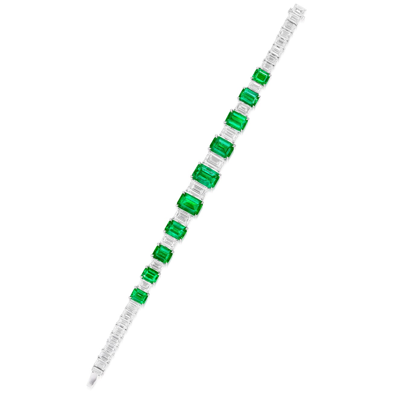Set with ten graduated step-cut emeralds weighing 16.51 carats in total, spaced and completed by emerald-cut diamonds, mounted in platinum, length approximately 165 mm.